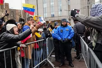 Outside the courthouse, police separated protesters of the U.S. military action from pro-intervention demonstrators. Inside the courtroom, as Maduro stood to leave with federal officers, a man in the audience stood and began speaking forcefully at him in Spanish, calling him an “illegitimate” president.